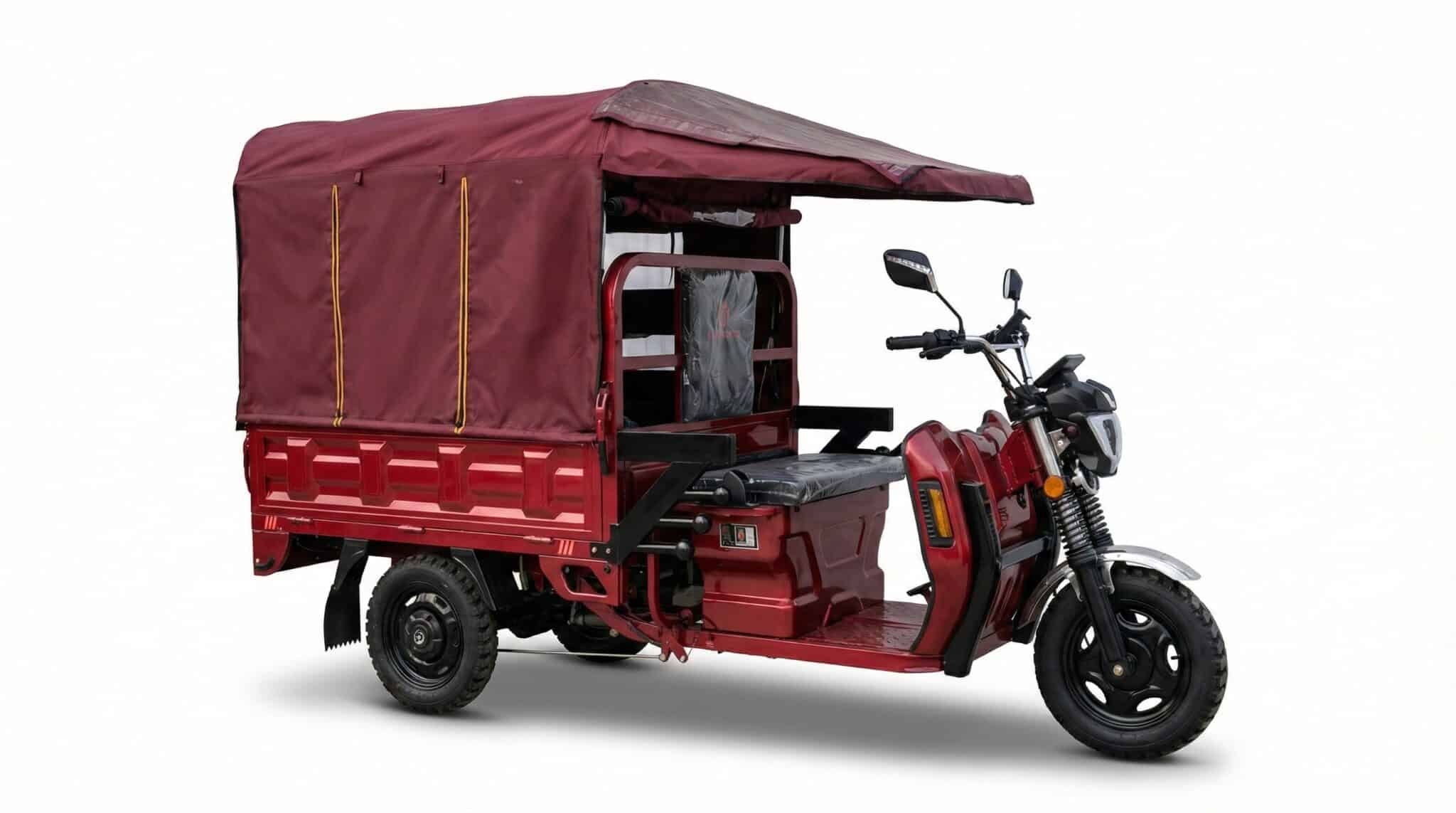 Triciclo de carga híbrido con autonomía extendida. Combina un motor eléctrico de 1000W con un generador a gasolina integrado, logrando un recorrido total de 150 km (50 km batería + 100 km combustible). Diseñado para el trabajo continuo, soporta 500 kg de carga y cuenta con techo protector sencillo para el conductor.